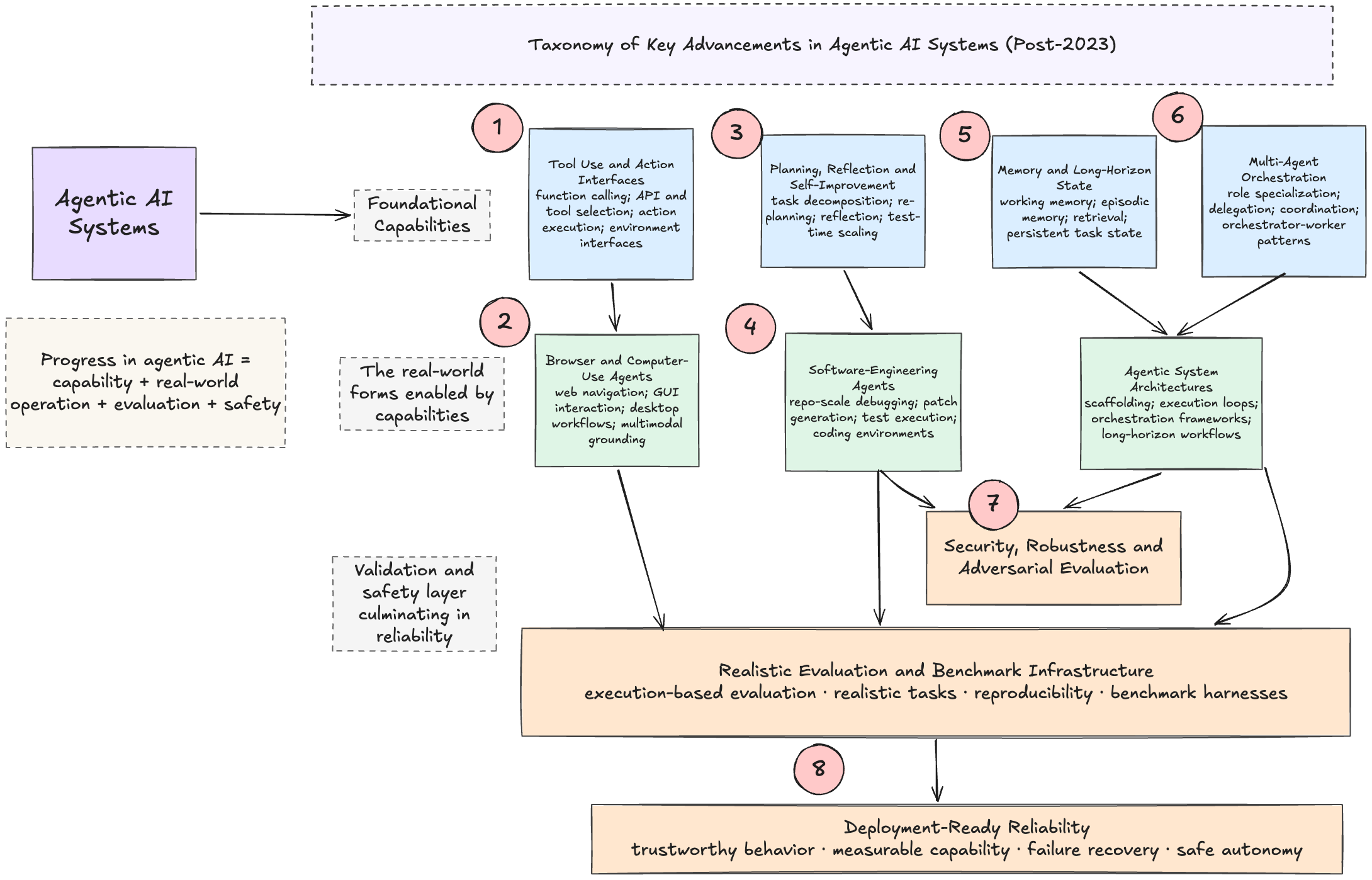Significance: This is a key aspect of development, given that agent progress is tightly coupled to benchmarks and harnesses. Agentic development moved toward execution-based, reproducible, increasingly realistic evaluations. The important shift was not just “more benchmarks,” but benchmarks that measure long-horizon action, side effects, multimodality, and real-world browsing/computer use. That makes this category the backbone for judging whether agent progress is genuine.